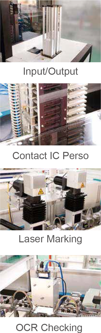32 кодировочные станции поставляются в стандартной комплектации, которые могут быть расширены до 64 станций, чтобы удовлетворить спрос на большой объем данных производства чипов; Статические станции perso и считыватели остаются неподвижными во время процесса электрической персонализации, чтобы обеспечить стабильную передачу данных и кодирование .